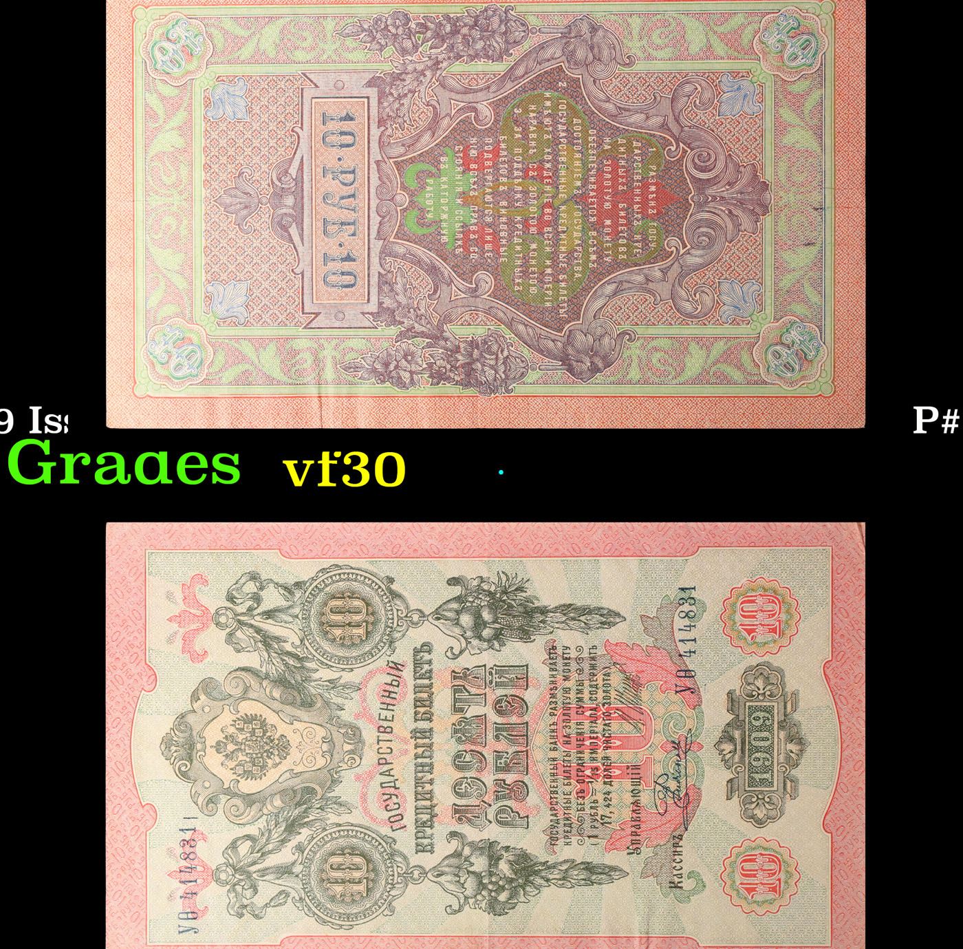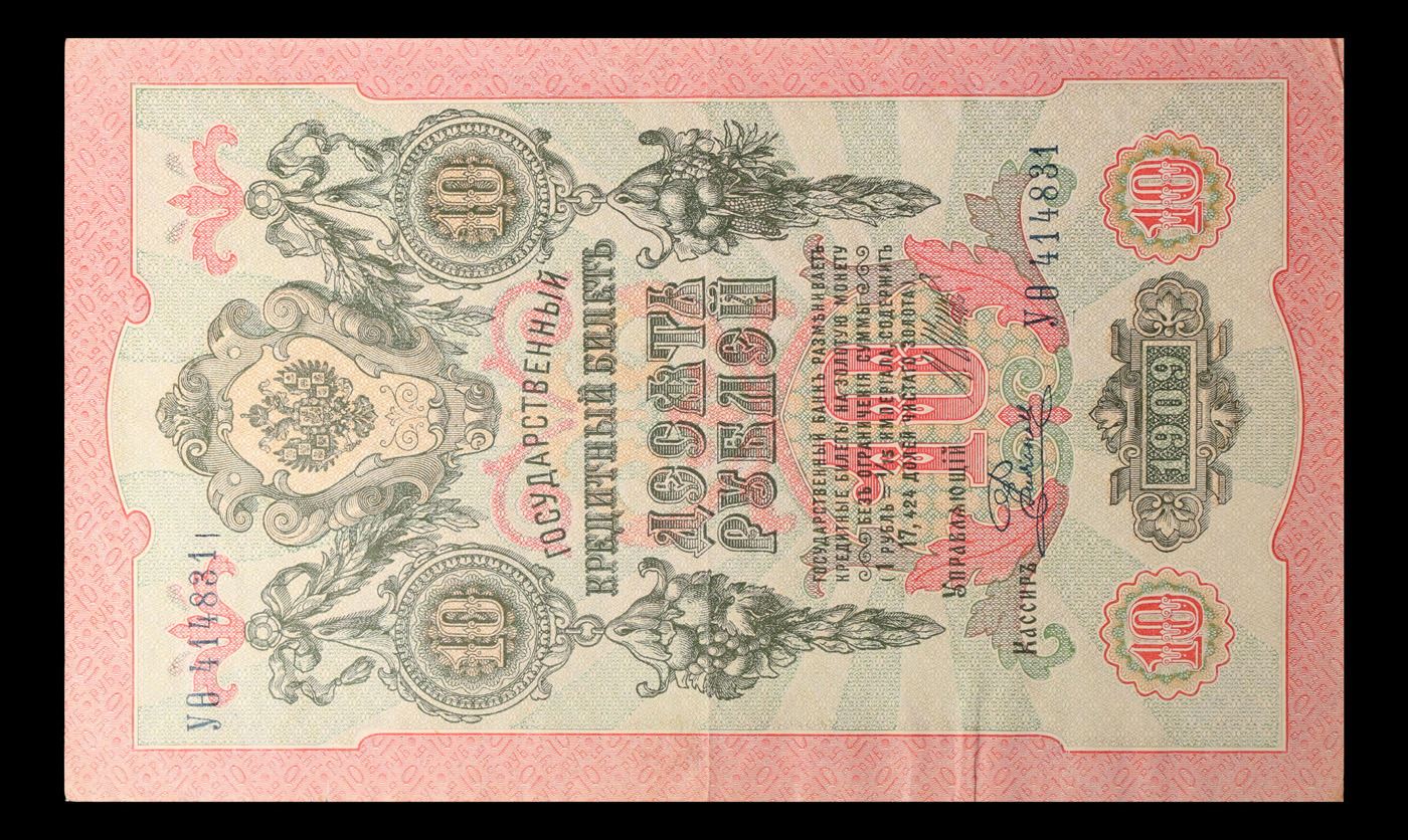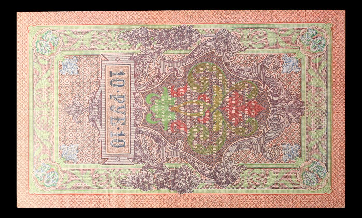 1912-1917 (1909 Issue) Imperial Russia 10 Rubles Banknote P# 11c, Sig. Shipov Grades vf++. Up for auction we have a beautiful, ornate Imperial Ruble note from the final decade of the Russian Empire under Tsar Nicholas II, which managed to survive through the Russian Revolution and Civil War. These notes became relatively useless in the early Soviet period, due to hyperinflation and other factors, and many were lost or destroyed. The 500 Ruble note features a portrait of Peter the Great, and the 100 Ruble note features a portrait of Catherine the Great.