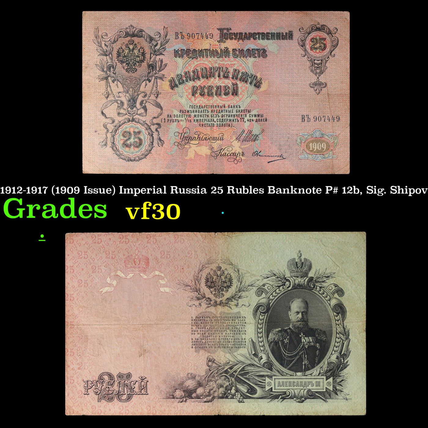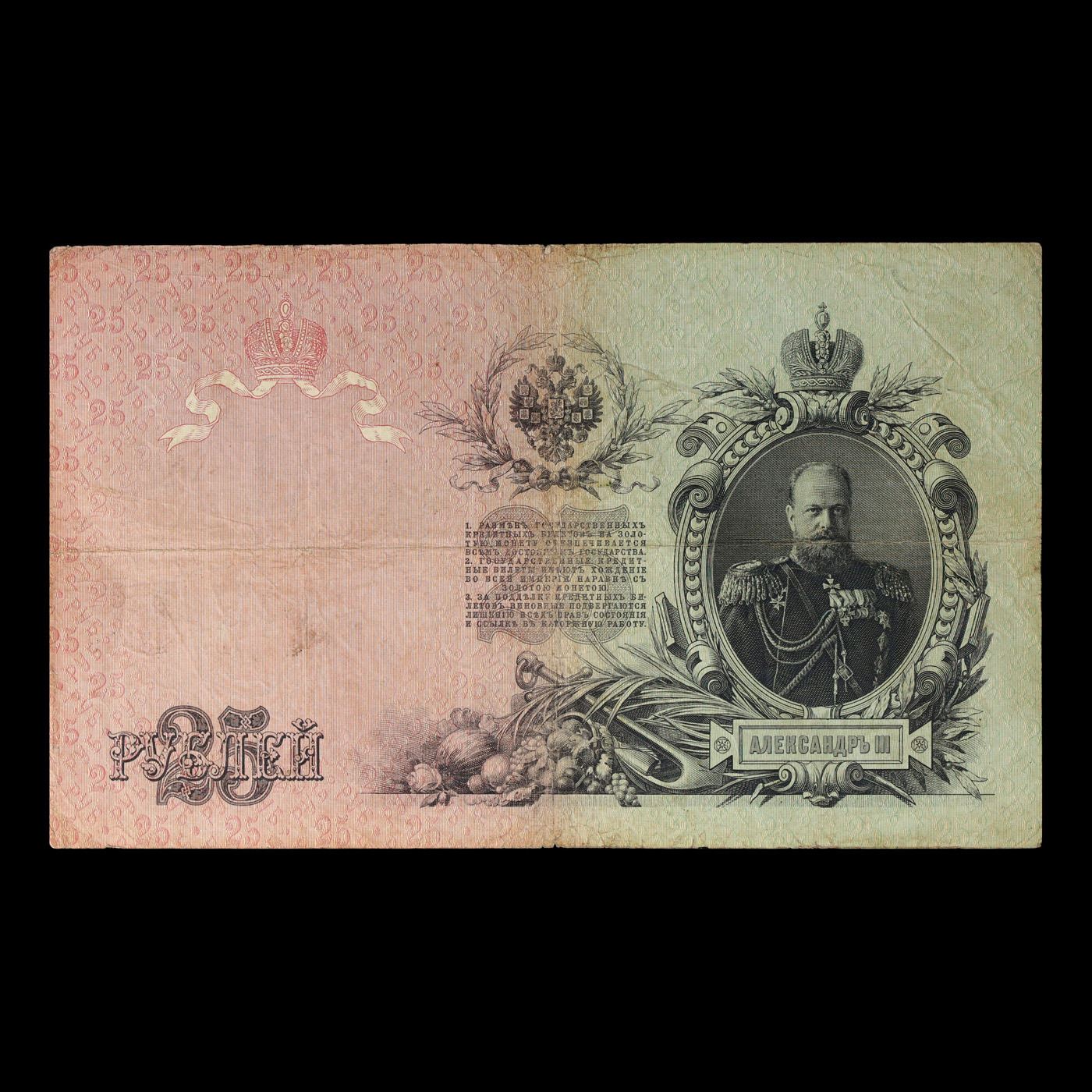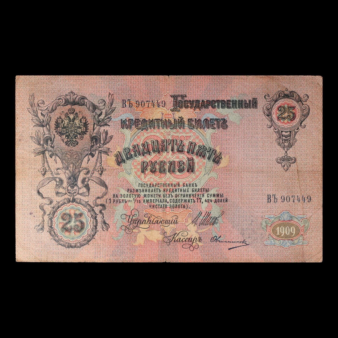 1912-1917 (1909 Issue) Imperial Russia 25 Rubles Banknote P# 12b, Sig. Shipov Grades vf++. Up for auction we have a beautiful, ornate Imperial Ruble note from the final decade of the Russian Empire under Tsar Nicholas II, which managed to survive through the Russian Revolution and Civil War. These notes became relatively useless in the early Soviet period, due to hyperinflation and other factors, and many were lost or destroyed. The 500 Ruble note features a portrait of Peter the Great, and the 100 Ruble note features a portrait of Catherine the Great.