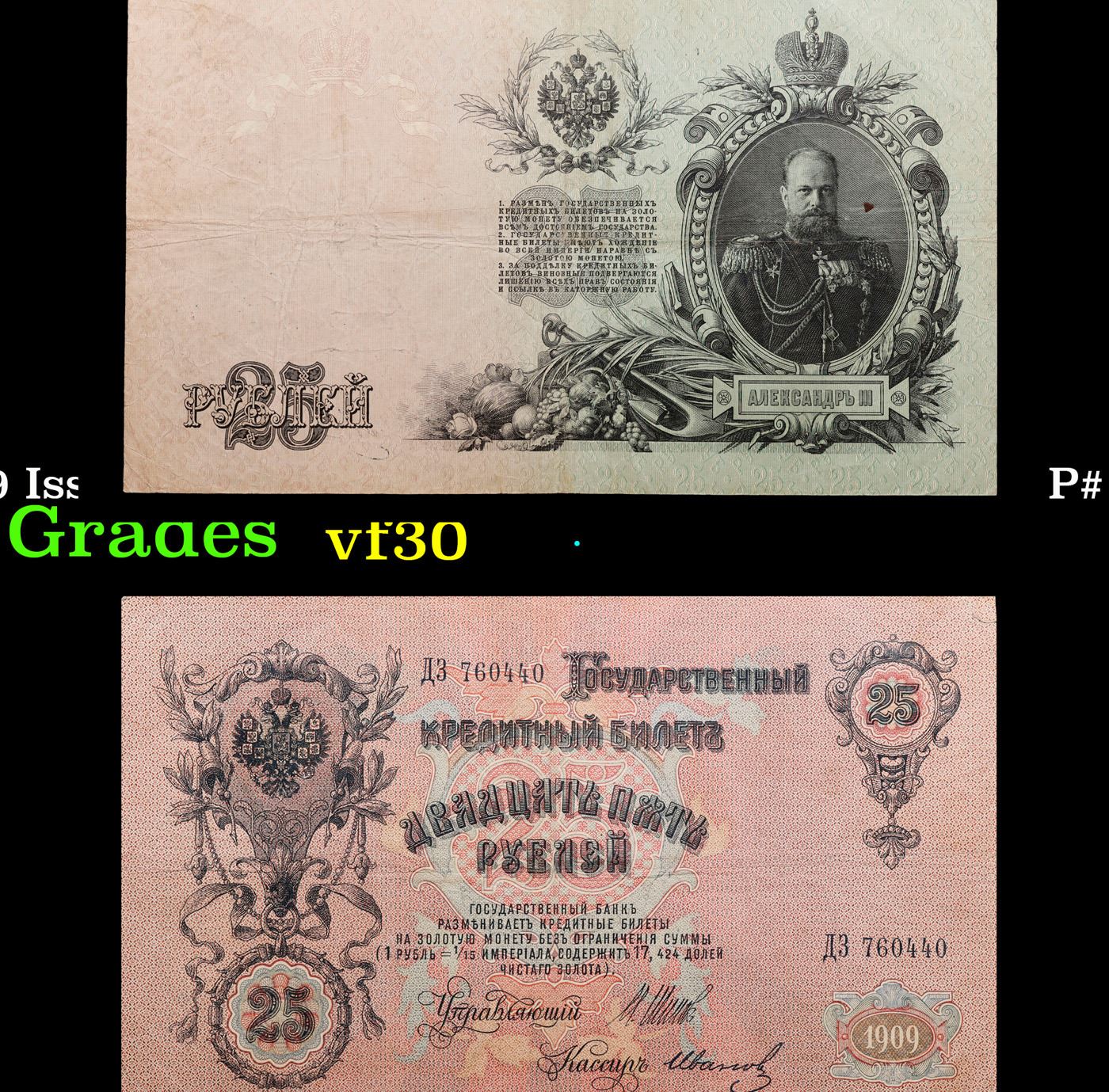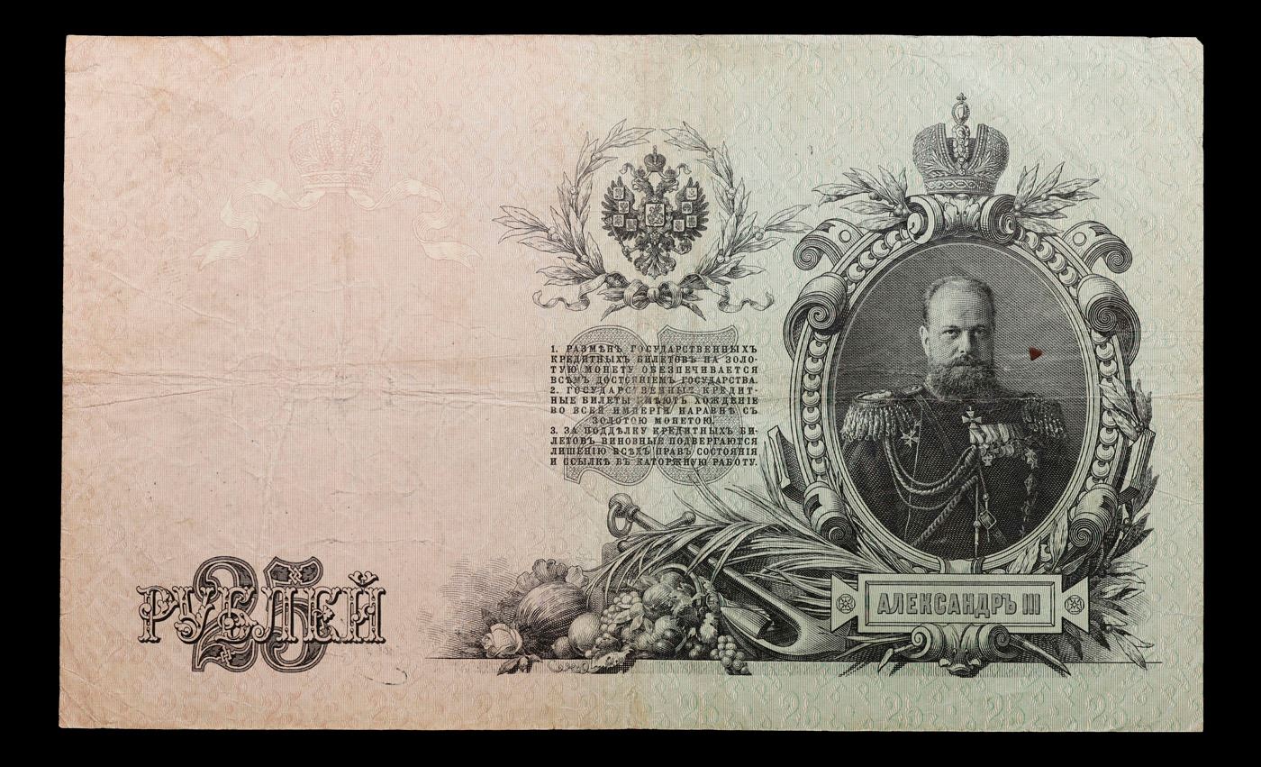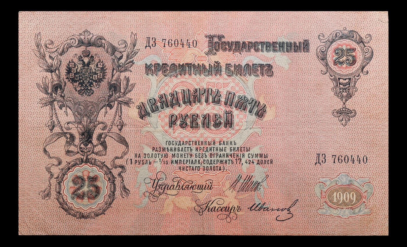 1912-1917 (1909 Issue) Imperial Russia 25 Rubles Banknote P# 12b, Sig. Shipov Grades vf++. Up for auction we have a beautiful, ornate Imperial Ruble note from the final decade of the Russian Empire under Tsar Nicholas II, which managed to survive through the Russian Revolution and Civil War. These notes became relatively useless in the early Soviet period, due to hyperinflation and other factors, and many were lost or destroyed. The 500 Ruble note features a portrait of Peter the Great, and the 100 Ruble note features a portrait of Catherine the Great.
