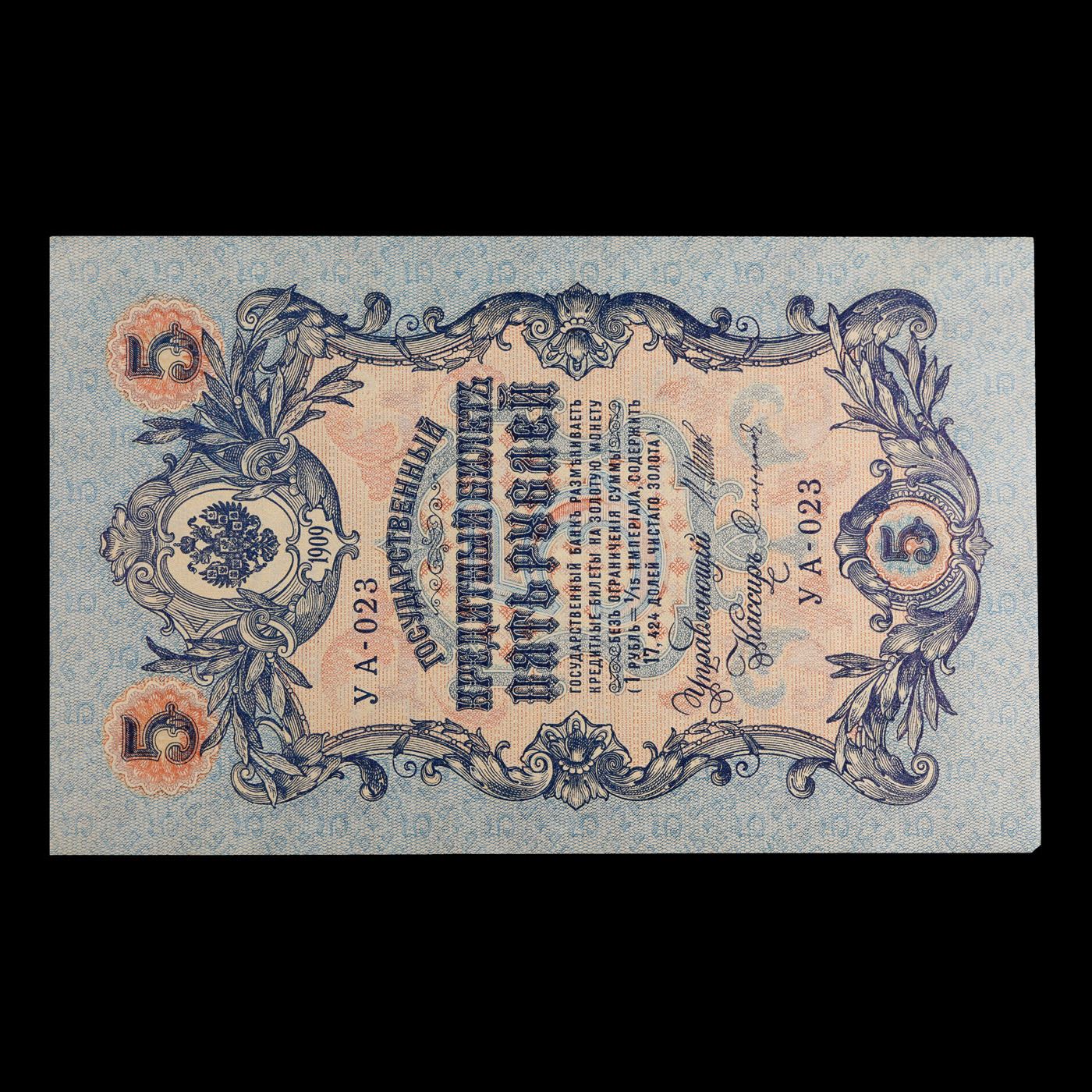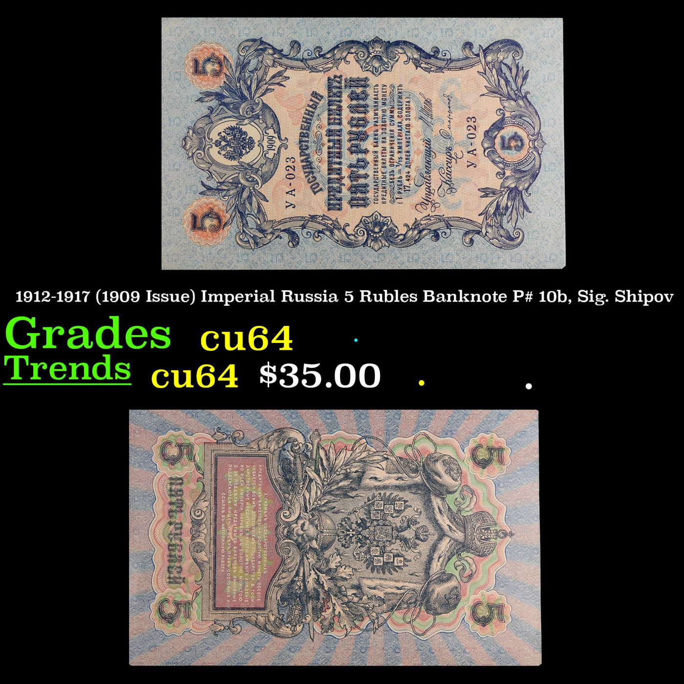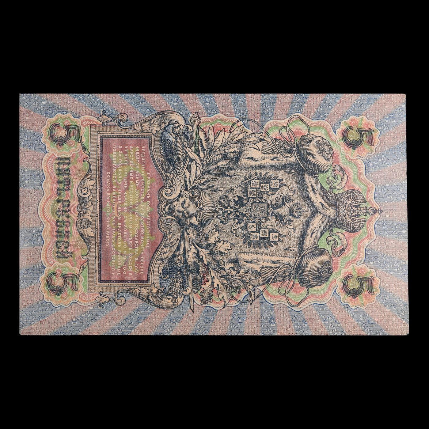 1912-1917 (1909 Issue) Imperial Russia 5 Rubles Banknote P# 10b, Sig. Shipov Grades Choice CU. Up for auction we have a beautiful, ornate Imperial Ruble note from the final decade of the Russian Empire under Tsar Nicholas II, which managed to survive through the Russian Revolution and Civil War. These notes became relatively useless in the early Soviet period, due to hyperinflation and other factors, and many were lost or destroyed. The 500 Ruble note features a portrait of Peter the Great, and the 100 Ruble note features a portrait of Catherine the Great.