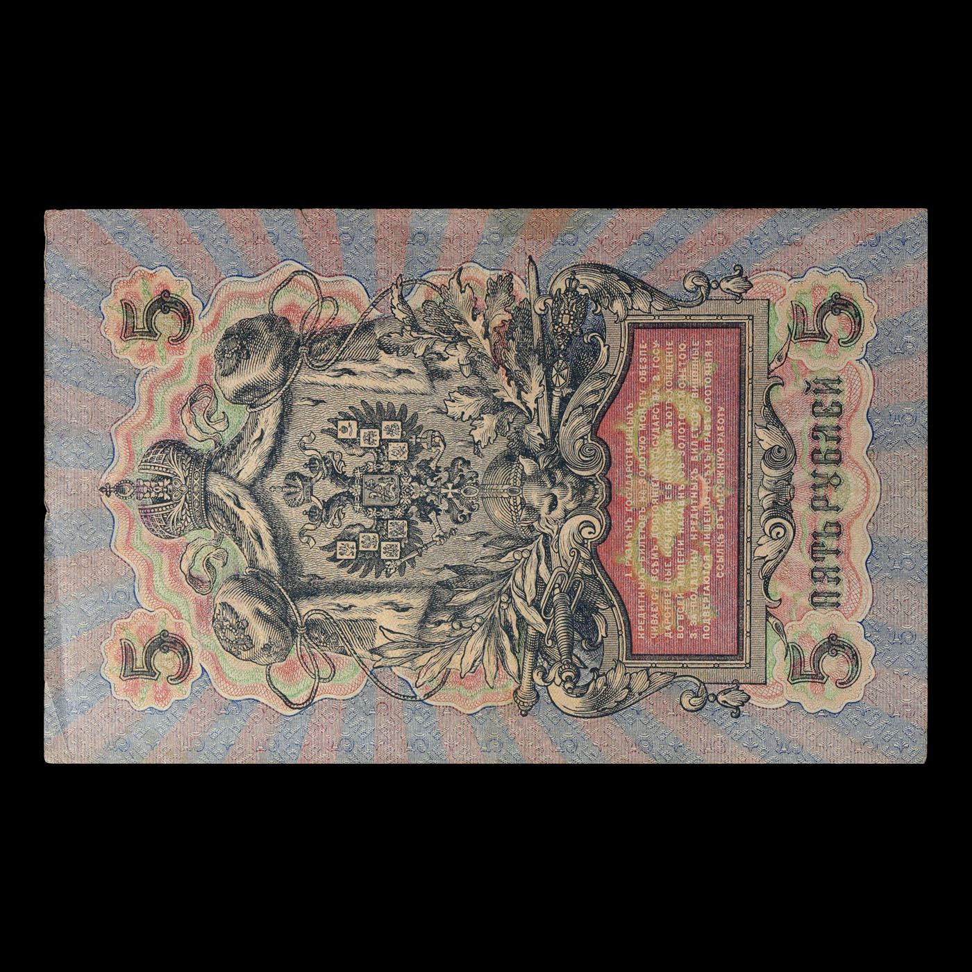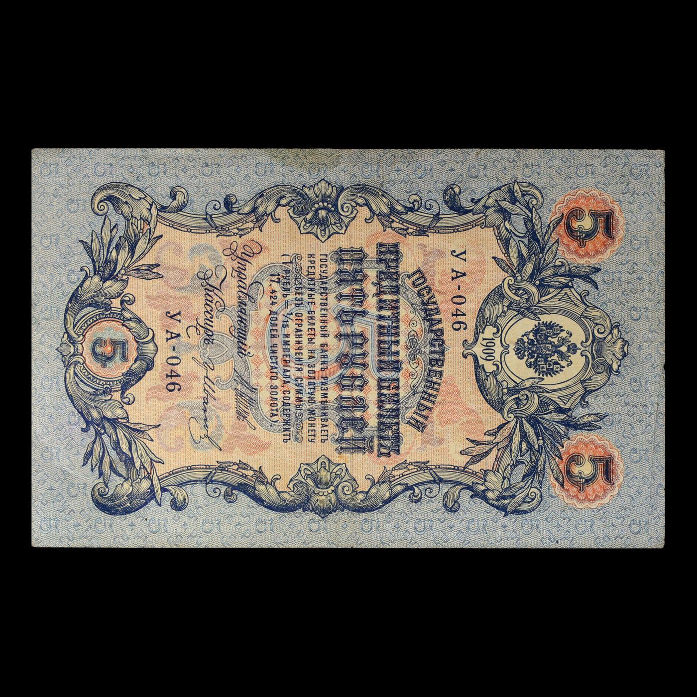 1912-1917 (1909 Issue) Imperial Russia 5 Rubles Banknote P# 10b, Sig. Shipov Grades Select AU. Up for auction we have a beautiful, ornate Imperial Ruble note from the final decade of the Russian Empire under Tsar Nicholas II, which managed to survive through the Russian Revolution and Civil War. These notes became relatively useless in the early Soviet period, due to hyperinflation and other factors, and many were lost or destroyed. The 500 Ruble note features a portrait of Peter the Great, and the 100 Ruble note features a portrait of Catherine the Great.