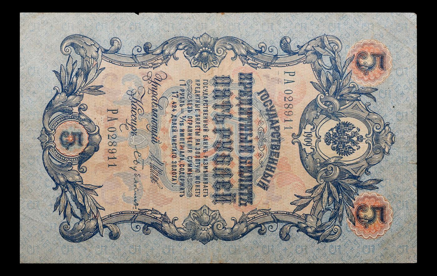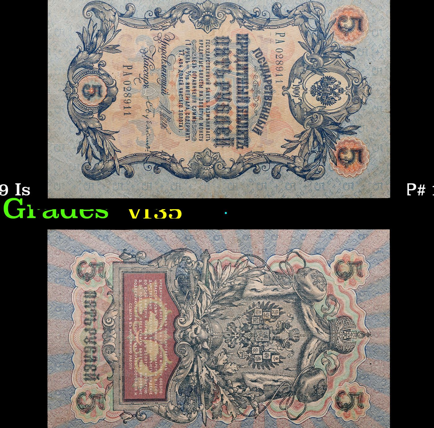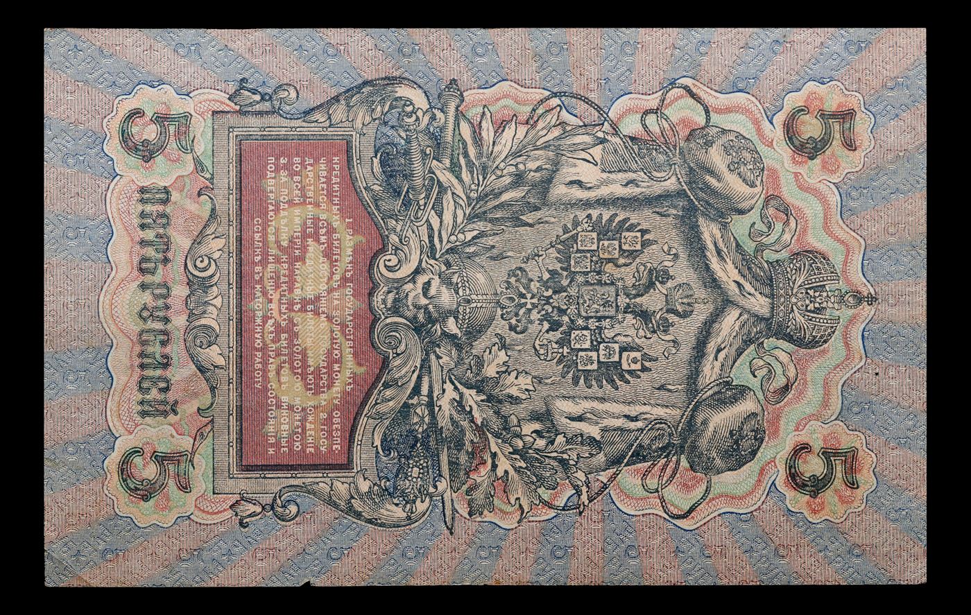 1912-1917 (1909 Issue) Imperial Russia 5 Rubles Banknote P# 10b, Sig. Shipov Grades vf++. Up for auction we have a beautiful, ornate Imperial Ruble note from the final decade of the Russian Empire under Tsar Nicholas II, which managed to survive through the Russian Revolution and Civil War. These notes became relatively useless in the early Soviet period, due to hyperinflation and other factors, and many were lost or destroyed. The 500 Ruble note features a portrait of Peter the Great, and the 100 Ruble note features a portrait of Catherine the Great.