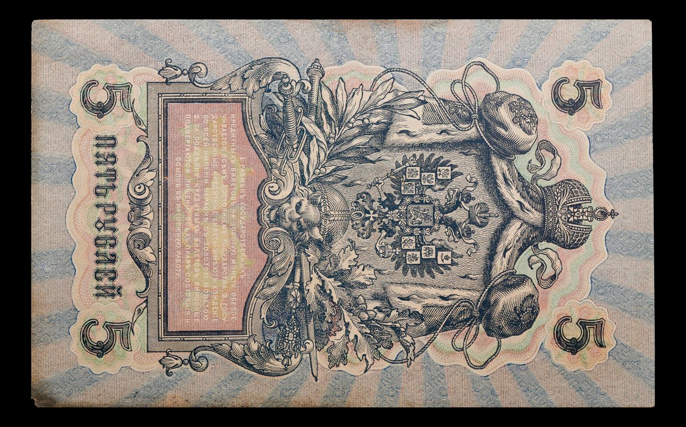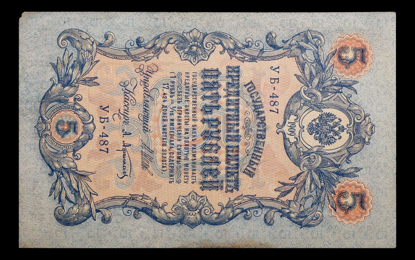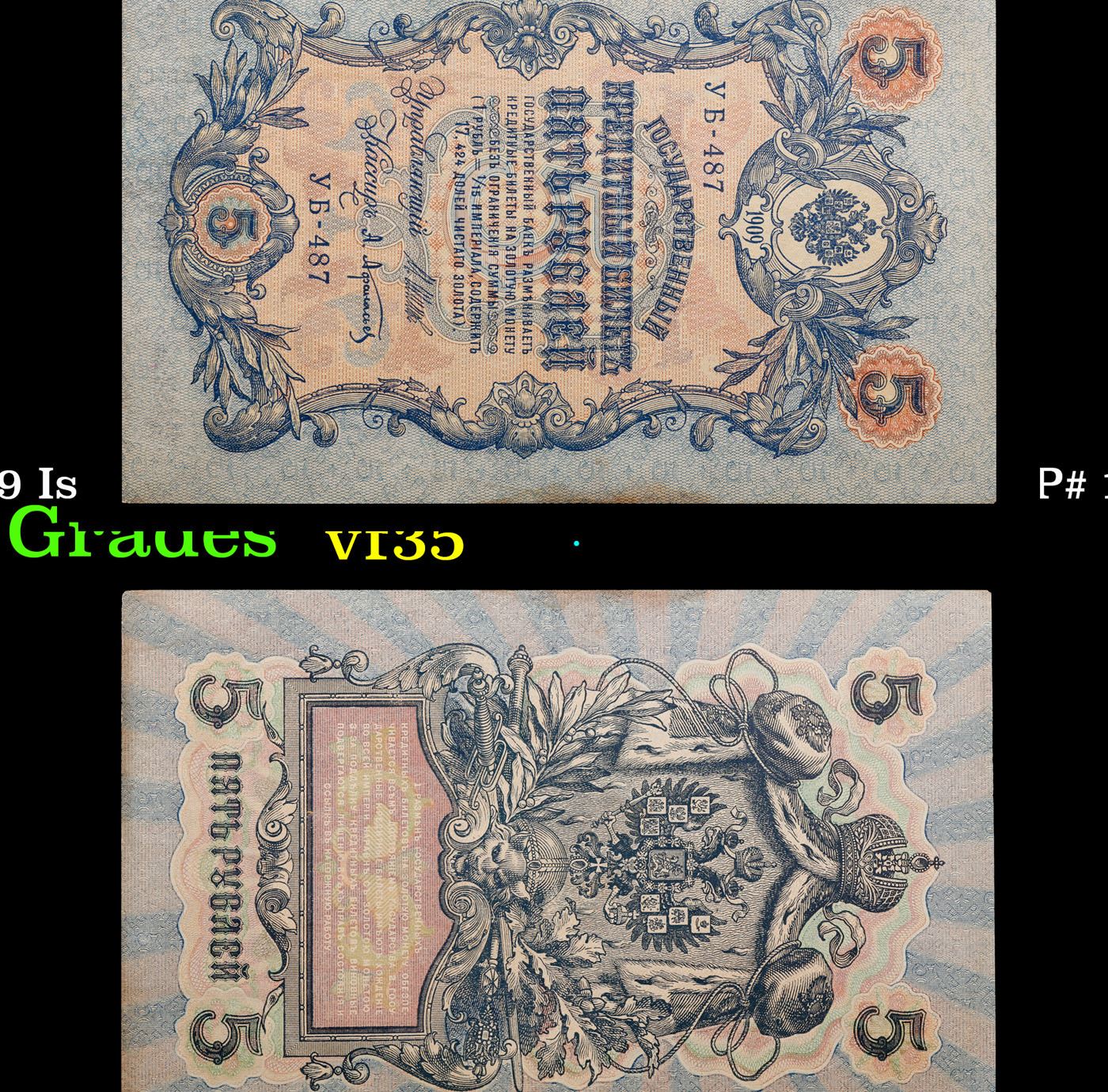 1912-1917 (1909 Issue) Imperial Russia 5 Rubles Banknote P# 10b, Sig. Shipov Grades vf++. Up for auction we have a beautiful, ornate Imperial Ruble note from the final decade of the Russian Empire under Tsar Nicholas II, which managed to survive through the Russian Revolution and Civil War. These notes became relatively useless in the early Soviet period, due to hyperinflation and other factors, and many were lost or destroyed. The 500 Ruble note features a portrait of Peter the Great, and the 100 Ruble note features a portrait of Catherine the Great.