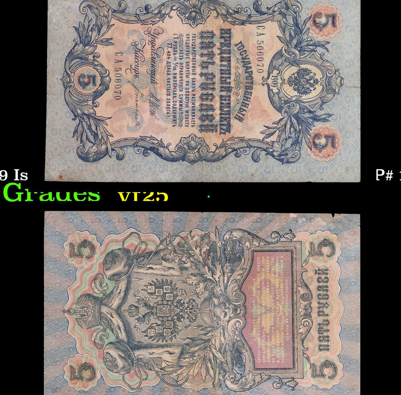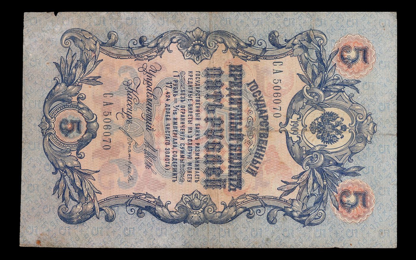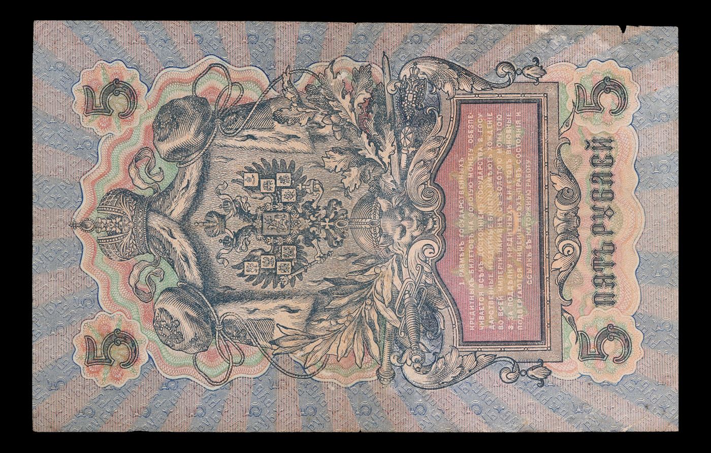 1912-1917 (1909 Issue) Imperial Russia 5 Rubles Banknote P# 10b, Sig. Shipov Grades vf+. Up for auction we have a beautiful, ornate Imperial Ruble note from the final decade of the Russian Empire under Tsar Nicholas II, which managed to survive through the Russian Revolution and Civil War. These notes became relatively useless in the early Soviet period, due to hyperinflation and other factors, and many were lost or destroyed. The 500 Ruble note features a portrait of Peter the Great, and the 100 Ruble note features a portrait of Catherine the Great.