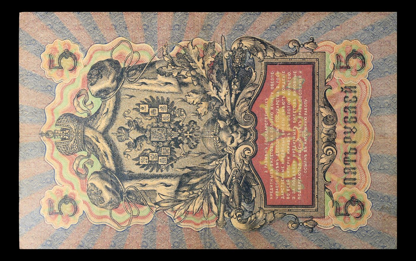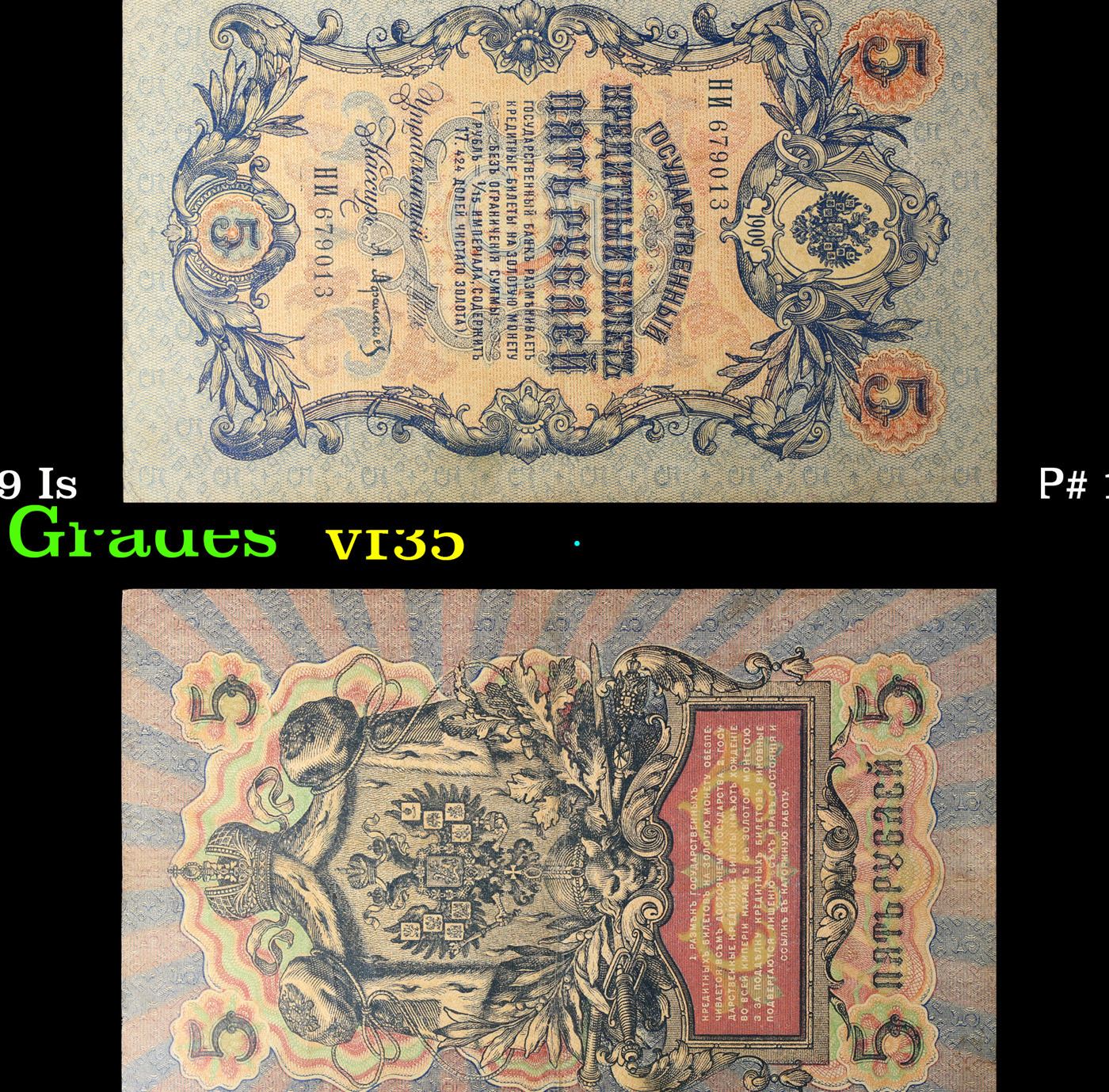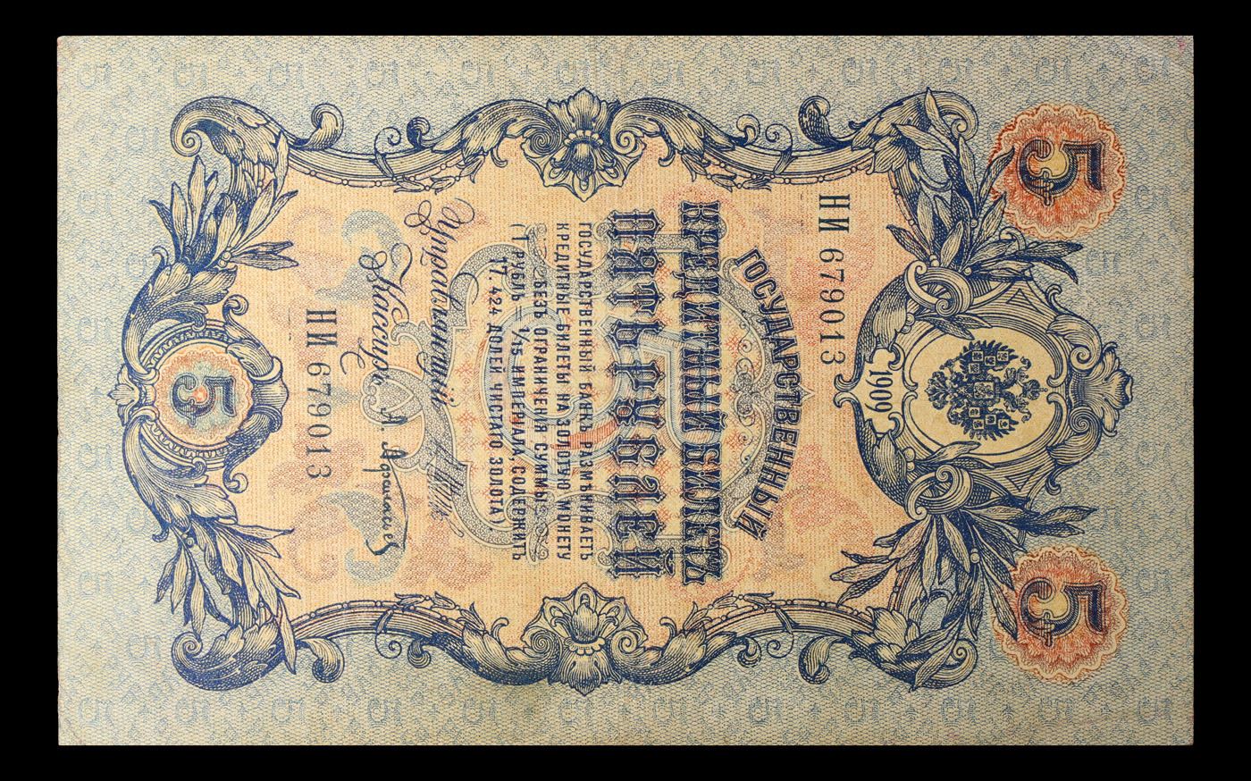 1912-1917 (1909 Issue) Imperial Russia 5 Rubles Banknote P# 10b, Sig. Shipov Grades vf++. Up for auction we have a beautiful, ornate Imperial Ruble note from the final decade of the Russian Empire under Tsar Nicholas II, which managed to survive through the Russian Revolution and Civil War. These notes became relatively useless in the early Soviet period, due to hyperinflation and other factors, and many were lost or destroyed. The 500 Ruble note features a portrait of Peter the Great, and the 100 Ruble note features a portrait of Catherine the Great.