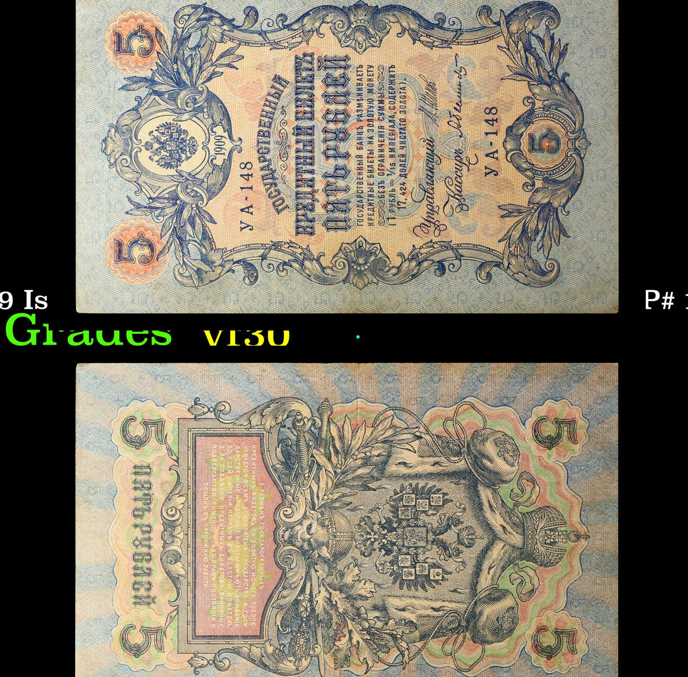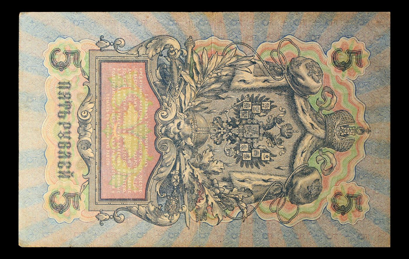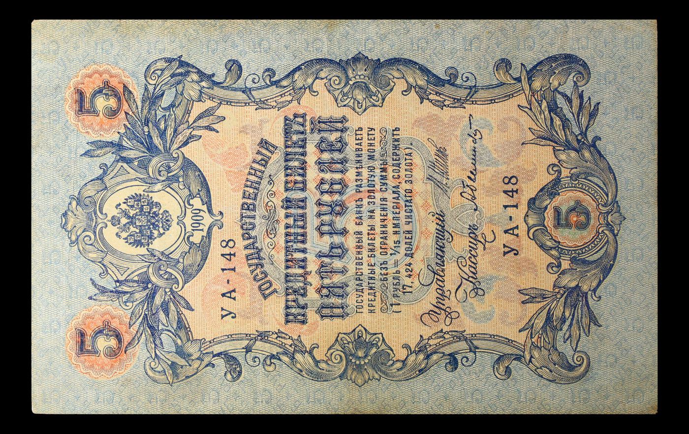 1912-1917 (1909 Issue) Imperial Russia 5 Rubles Banknote P# 10b, Sig. Shipov Grades vf++. Up for auction we have a beautiful, ornate Imperial Ruble note from the final decade of the Russian Empire under Tsar Nicholas II, which managed to survive through the Russian Revolution and Civil War. These notes became relatively useless in the early Soviet period, due to hyperinflation and other factors, and many were lost or destroyed. The 500 Ruble note features a portrait of Peter the Great, and the 100 Ruble note features a portrait of Catherine the Great.