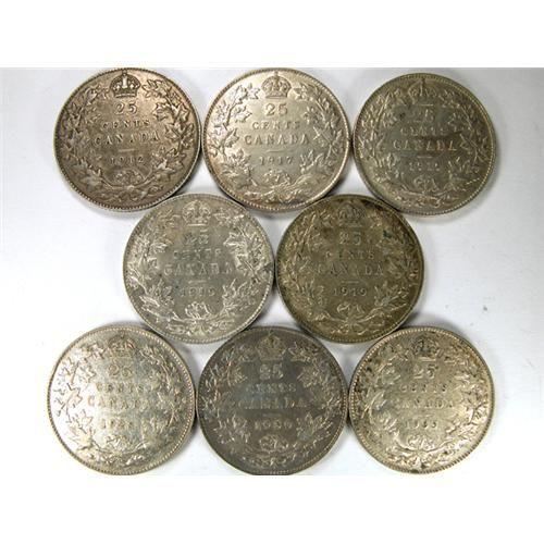 Canada Twenty-Five Cents 1912, 1917, 1919 three pieces, 1928, 1930 and 1935. Eight pale to lightly toned pieces, all VF-EF