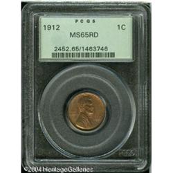 1912 1C MS65 Red PCGS. A lustrous, intricately str <B>1912 1C MS65 Red PCGS.</B></I> A lustrous, intricately struck, and unabraded brick-red Cent. A thin streak of rose color crosses the O in ONE, a trace of carbon is present, and a few green hairs are encapsulated along the reverse border. <BR><BR><B>Important notice:</B> Heritage usually auctions material at the rate of 200-250 lots per hour. On some occasions eBay Live bid software or the Internet may not be able to keep up with the pace of the auction. We recommend placing a realistic absentee bid now as insurance to avoid disappointment. Occasionally the auctioneer may eliminate or reject an eBay Live bid, and the auctioneer may also reopen a lot after the close of the eBay live bidding (usually because we missed an audience bid), and may reject your bid even if it shows you as the winning bidder. By bidding via eBay Live, you agree that Heritage may award the lot to another bidder at its sole discretion under the circumstances described above or any other reasonable circumstances. Since eBay bids are not shown to us until we open the lot on the floor, we treat those bids just like floor bids. In most cases the floor responds before the eBay bid is presented to us, due to Internet lag time, so for consistency we have made it a policy that floor bids are always considered first over tie eBay live bids. Also please note that all Heritage lots purchased through eBay Live carry a 20% Buyer's Premium. Please make sure you read the Terms and Conditions before you bid. This lot is being auctioned in conjunction with a live floor auction by Heritage Galleries & Auctioneers. All final auction and invoice information will be supplied by Heritage Galleries & Auctioneers, and all other information should be considered preliminary. Lot:5229
