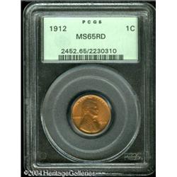 1912 1C MS65 Red PCGS. Sharply struck with bright <B>1912 1C MS65 Red PCGS.</B></I> Sharply struck with bright orange-red luster, and carefully preserved surfaces that reveal just one or two small contact marks, and a handful of well scattered carbon specks, on both obverse and reverse.<BR><I>From The Dennis Dewart Collection.</B></I> <BR><BR><B>Important notice:</B> Heritage usually auctions material at the rate of 200-250 lots per hour. On some occasions eBay Live bid software or the Internet may not be able to keep up with the pace of the auction. We recommend placing a realistic absentee bid now as insurance to avoid disappointment. Occasionally the auctioneer may eliminate or reject an eBay Live bid, and the auctioneer may also reopen a lot after the close of the eBay live bidding (usually because we missed an audience bid), and may reject your bid even if it shows you as the winning bidder. By bidding via eBay Live, you agree that Heritage may award the lot to another bidder at its sole discretion under the circumstances described above or any other reasonable circumstances. Since eBay bids are not shown to us until we open the lot on the floor, we treat those bids just like floor bids. In most cases the floor responds before the eBay bid is presented to us, due to Internet lag time, so for consistency we have made it a policy that floor bids are always considered first over tie eBay live bids. Also please note that all Heritage lots purchased through eBay Live carry a 20% Buyer's Premium. Please make sure you read the Terms and Conditions before you bid. This lot is being auctioned in conjunction with a live floor auction by Heritage Galleries & Auctioneers. All final auction and invoice information will be supplied by Heritage Galleries & Auctioneers, and all other information should be considered preliminary. Lot:5140