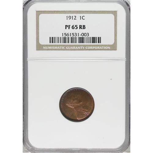 <B>1912 1C PR65 Red and Brown NGC.</B></I> A rare issue in proof format, here represented by a beautiful piece with purple and blue hues on each side. A boldly struck example of this issue, with coarse-grained matte surfaces. The recorded mintage is 2,145 coins, but examples are more difficult in high grades than the 1910 or 1911 proofs.<BR><BR><b>Shipping:</b> Coins & Currency (<a target="_blank" href="http://www.heritageauctions.com/common/shipping.php">view shipping information</a>)