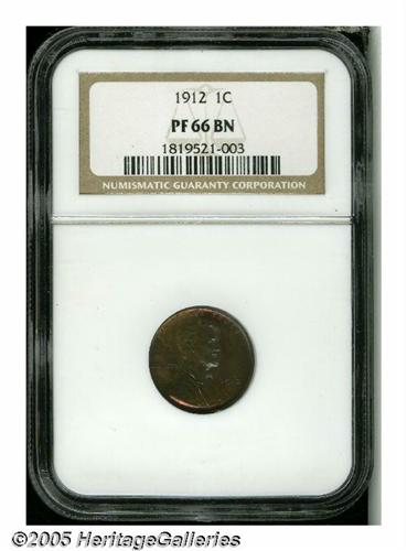 <B>1912<1C> PR66 Brown NGC.</B></I> One of only 2,145 proofs struck in this year. This example reveals variegated cobalt-blue, crimson, and brown patination, and is devoid of significant contact marks or unsightly spots. The design elements are well struck throughout. Population: 9 in 66, 3 finer (5/05).