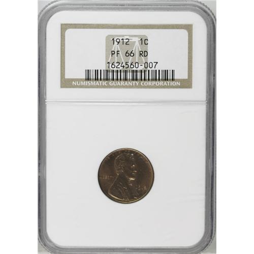 <B>1912<1C> PR66 Red NGC.</B></I> We cannot overstate the importance of this Gem full red proof Lincoln cent for specialists in this long-lived and popular series. Only two 1912 examples have received a PR66 Red grade from the major grading services: the present example and a specimen at PCGS. None are finer (7/06). As befits the issue, both sides display a matte finish that is coarser than that seen on the typical survivor from the two preceding proof deliveries. The texture is undisturbed by even a single noteworthy handling mark, and each side has only two nearly microscopic carbon flecks. Needle-sharp striking definition characterizes all of the fully lustrous, straw-gold features. This coin is from a middle to later state of the dies as outlined in Lange's Lincoln cent reference, showing numerous die polish lines through 91 in the date, through ERTY, and above the T in TRUST.<BR> In terms of total number of coins known, the 1912 is not as rare as either the 1909 VDB or the 1916. However, David Lange notes that the 1912, as a full red Gem, is the rarest of the three issues. The author also speculates that many of the 2,145 proof Lincoln cents prepared in 1912 may have been melted as unsold. The coin in this lot is among the most significant cent offerings in this auction. Census: 1 in 66 Red, 0 finer (7/06).