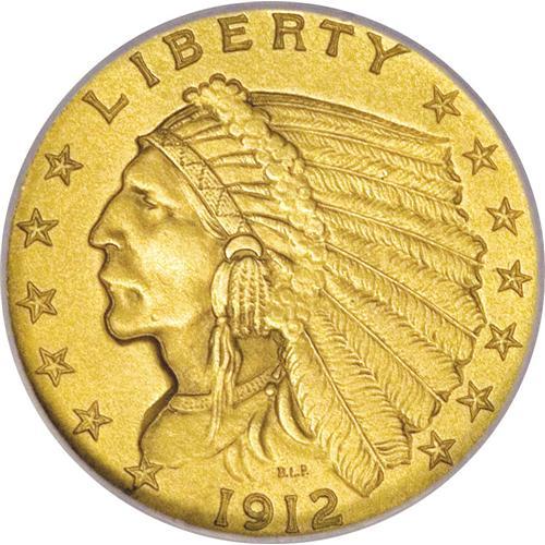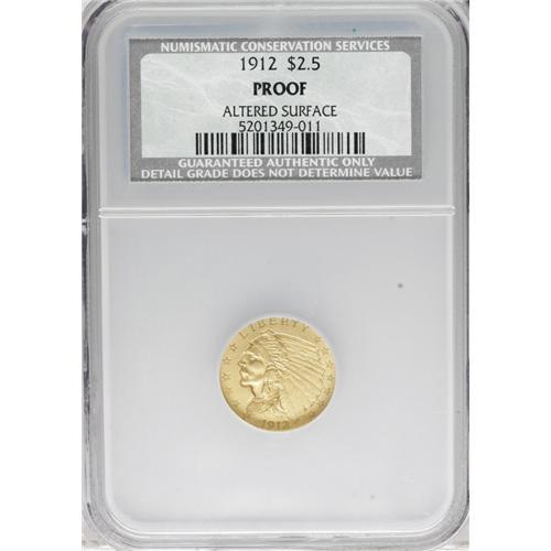 <B>1912 $2 1/2 --Altered Surfaces--NCS. Proof.</B></I> The mint made various modifications on the Indian quarter eagle proofs from 1908 to 1915. Walter Breen (1977) wrote that the 1912 proof had a "Fine sandblast finish. Different from all previous matte coins; under a microscope the surfaces show millions of minute shiny facets." Jeff Garrett and Ron Guth (2006) add that the 1912 texture " ... reflects the light with reflective microscopic facets." The uniform khaki-gold surfaces on the piece in this lot are subdued, and do not display the "sparkle" ordinarily seen on the issue. We are unable to determine the cause or causes of the surfaces alteration. In any event, the 1912 is one of the scarcest of the Indian proof issues, with approximately 55 to 65 known.<BR><BR><b>Shipping:</b> Coins & Currency (<a target="_blank" href="http://www.heritageauctions.com/common/shipping.php">view shipping information</a>)