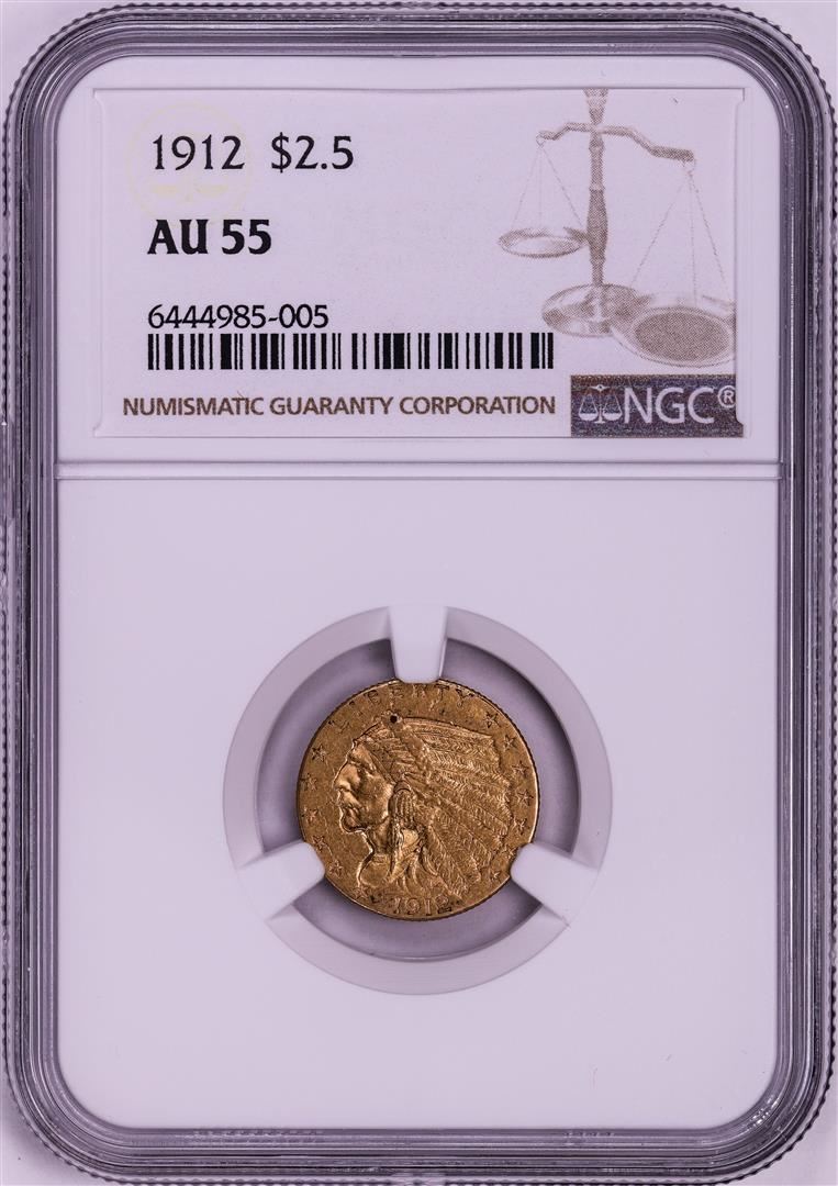 One 1912 $2 1/2 Indian Head Quarter Eagle Gold Coin NGC AU55. NGC Certified.