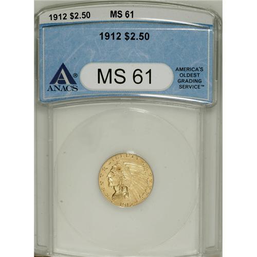 <B>1912 $2 1/2 MS61 ANACS.</B></I> NGC Census: (1253/2776). PCGS Population (307/1698). Mintage: 616,000. Numismedia Wsl. Price for NGC/PCGS coin in MS61: $332. (#7944)<BR><BR><b>Shipping:</b> Coins & Currency (<a target="_blank" href="http://www.heritageauctions.com/common/shipping.php">view shipping information</a>)