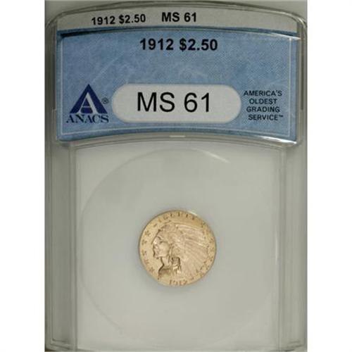 <B>1912 $2 1/2 MS61 ANACS.</B></I> NGC Census: (1389/2996). PCGS Population (317/1867). Mintage: 616,000. Numismedia Wsl. Price for NGC/PCGS coin in MS61: $355. (#7944)<BR><BR><B>Coin Engraver:</B> Bela Lyon Pratt<BR><BR><b>Shipping:</b> Coins & Currency (<a target="_blank" href="http://www.heritageauctions.com/common/shipping.php">view shipping information</a>)