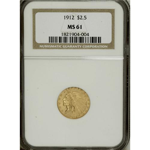 <B>1912 $2 1/2 MS61 NGC.</B></I> NGC Census: (1235/2748). PCGS Population (307/1698). Mintage: 616,000. Numismedia Wsl. Price: $332. (#7944)<BR><BR><b>Shipping:</b> Coins & Currency (<a target="_blank" href="http://www.heritageauctions.com/common/shipping.php">view shipping information</a>)