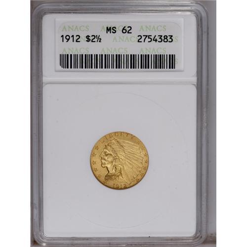 <B>1912<$2 1/2> MS62 ANACS.</B></I> A reasonably struck khaki-gold example of this popular and collectible type. No singular marks require mention.