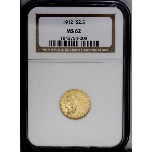 <B>1912<$2 1/2> MS62 NGC.</B></I> Brassy-gold surfaces yield well defined design features. A linear mark is concealed in the eagle's left wing, and some wispy slide marks are seen in the fields, especially on the reverse. <BR><BR><B>Important notice:</B> Heritage usually auctions material at the rate of 200-250 lots per hour. On some occasions eBay Live bid software or the Internet may not be able to keep up with the pace of the auction. We recommend placing a realistic absentee bid now as insurance to avoid disappointment. Occasionally the auctioneer may eliminate or reject an eBay Live bid, and the auctioneer may also reopen a lot after the close of the eBay live bidding (usually because we missed an audience bid), and may reject your bid even if it shows you as the winning bidder. By bidding via eBay Live, you agree that Heritage may award the lot to another bidder at its sole discretion under the circumstances described above or any other reasonable circumstances. Since eBay bids are not shown to us until we open the lot on the floor, we treat those bids just like floor bids. In most cases the floor responds before the eBay bid is presented to us, due to Internet lag time, so for consistency we have made it a policy that floor bids are always considered first over tie eBay live bids. Also please note that all Heritage lots purchased through eBay Live carry a 20% Buyer's Premium. Please make sure you read the Terms and Conditions before you bid. This lot is being auctioned in conjunction with a live floor auction by Heritage Galleries & Auctioneers. All final auction and invoice information will be supplied by Heritage Galleries & Auctioneers, and all other information should be considered preliminary. Lot:2491 <BR><BR><B>Winning Notification and Billing:</B> After the FINAL session in this auction is complete, Heritage will send e-mail and snail mail invoices. This process normally takes several days. All final auction and invoice information will be supplied by Heritage Galleries & Auctioneers, and all other information should be considered preliminary. <BR><BR>This auction will be conducted on a live auction floor and over the Internet through eBay Live. If you choose to place an absentee bid, please take a moment to <font color='#0000ff'><u><a href='http://pages.ebay.com/liveauctions/help/before/laabsentee.html'>learn how eBay Live absentee bidding works</a></u></font><font color='#000000'>