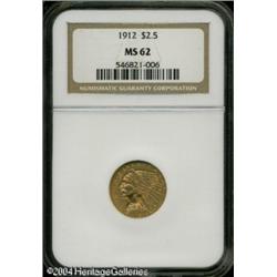 1912 $2 1/2 MS62 NGC. Generally well struck, with <B>1912 $2 1/2 MS62 NGC.</B></I> Generally well struck, with straw-gold patina. The surfaces are somewhat muted, and display some minute marks on the Indian's cheek, and in the fields of both sides. <BR><BR><B>Important notice:</B> Heritage usually auctions material at the rate of 200-250 lots per hour. On some occasions eBay Live bid software or the Internet may not be able to keep up with the pace of the auction. We recommend placing a realistic absentee bid now as insurance to avoid disappointment. Occasionally the auctioneer may eliminate or reject an eBay Live bid, and the auctioneer may also reopen a lot after the close of the eBay live bidding (usually because we missed an audience bid), and may reject your bid even if it shows you as the winning bidder. By bidding via eBay Live, you agree that Heritage may award the lot to another bidder at its sole discretion under the circumstances described above or any other reasonable circumstances. Since eBay bids are not shown to us until we open the lot on the floor, we treat those bids just like floor bids. In most cases the floor responds before the eBay bid is presented to us, due to Internet lag time, so for consistency we have made it a policy that floor bids are always considered first over tie eBay live bids. Also please note that all Heritage lots purchased through eBay Live carry a 20% Buyer's Premium. Please make sure you read the Terms and Conditions before you bid. This lot is being auctioned in conjunction with a live floor auction by Heritage Galleries & Auctioneers. All final auction and invoice information will be supplied by Heritage Galleries & Auctioneers, and all other information should be considered preliminary. Lot:6552