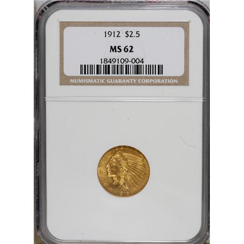 <B>1912 $2 1/2 MS62 NGC.</B></I> NGC Census: (1637/1136). PCGS Population (787/911). Mintage: 616,000. Numismedia Wsl. Price: $590. (#7944)<BR><BR><b>Shipping:</b> Coins & Currency (<a target="_blank" href="http://www.heritageauctions.com/common/shipping.php">view shipping information</a>)