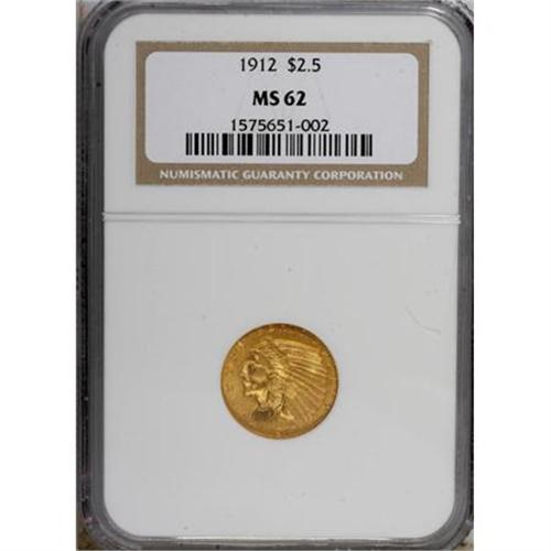 <B>1912 $2 1/2 MS62 NGC.</B></I> NGC Census: (1677/1161). PCGS Population (802/934). Mintage: 616,000. Numismedia Wsl. Price for NGC/PCGS coin in MS62: $590. (#7944)<BR><BR><B>Coin Engraver:</B> Bela Lyon Pratt<BR><BR><b>Shipping:</b> Coins & Currency (<a target="_blank" href="http://www.heritageauctions.com/common/shipping.php">view shipping information</a>\)