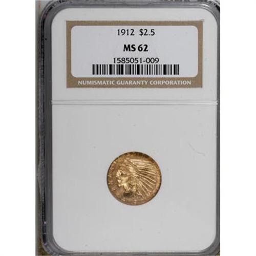 <B>1912 $2 1/2 MS62 NGC.</B></I> NGC Census: (1688/1168). PCGS Population (806/951). Mintage: 616,000. Numismedia Wsl. Price for NGC/PCGS coin in MS62: $590. (#7944)<BR><BR><B>Coin Engraver:</B> Bela Lyon Pratt<BR><BR><b>Shipping:</b> Coins & Currency (<a target="_blank" href="http://www.heritageauctions.com/common/shipping.php">view shipping information</a>)