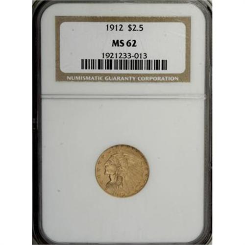 <B>1912 $2 1/2 MS62 NGC.</B></I> . NGC Census: (1776/1221). PCGS Population (851/1001). Mintage: 616,000. Numismedia Wsl. Price for NGC/PCGS coin in MS62: $525. (#7944)<BR><BR><B>Coin Engraver:</B> Bela Lyon Pratt<BR><BR><b>Shipping:</b> Coins & Currency (<a target="_blank" href="http://www.heritageauctions.com/common/shipping.php">view shipping information</a>)