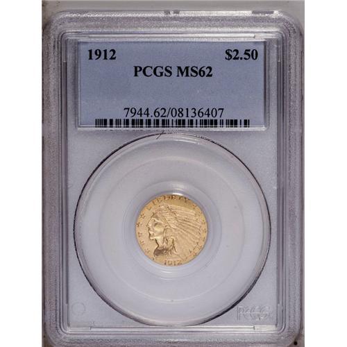 <B>1912<$2 1/2> MS62 PCGS.</B></I> Lustrous and without serious marks, with beginnings of tan-golden patina on each side.