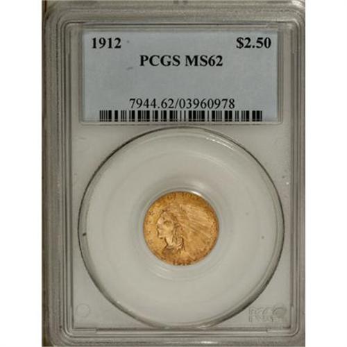 <B>1912 $2 1/2 MS62 PCGS.</B></I> PCGS Population (831/988). NGC Census: (1742/1198). Mintage: 616,000. Numismedia Wsl. Price for NGC/PCGS coin in MS62: $525. (#7944)<BR><BR><B>Coin Engraver:</B> Bela Lyon Pratt<BR><BR><b>Shipping:</b> Coins & Currency (<a target="_blank" href="http://www.heritageauctions.com/common/shipping.php">view shipping information</a>)