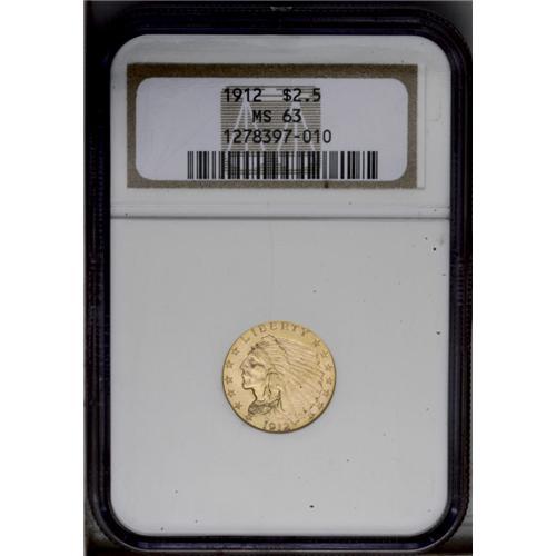 <B>1912<$2 1/2> MS63 NGC.</B></I> A couple of light abrasions in the obverse field before the Indian's face, and slight strike weakness account for the grade. Nonetheless attractive, with moderately lustrous straw-gold surfaces. <BR><BR><B>Important notice:</B> Heritage usually auctions material at the rate of 200-250 lots per hour. On some occasions eBay Live bid software or the Internet may not be able to keep up with the pace of the auction. We recommend placing a realistic absentee bid now as insurance to avoid disappointment. Occasionally the auctioneer may eliminate or reject an eBay Live bid, and the auctioneer may also reopen a lot after the close of the eBay live bidding (usually because we missed an audience bid), and may reject your bid even if it shows you as the winning bidder. By bidding via eBay Live, you agree that Heritage may award the lot to another bidder at its sole discretion under the circumstances described above or any other reasonable circumstances. Since eBay bids are not shown to us until we open the lot on the floor, we treat those bids just like floor bids. In most cases the floor responds before the eBay bid is presented to us, due to Internet lag time, so for consistency we have made it a policy that floor bids are always considered first over tie eBay live bids. Also please note that all Heritage lots purchased through eBay Live carry a 20% Buyer's Premium. Please make sure you read the Terms and Conditions before you bid. This lot is being auctioned in conjunction with a live floor auction by Heritage Galleries & Auctioneers. All final auction and invoice information will be supplied by Heritage Galleries & Auctioneers, and all other information should be considered preliminary. Lot:2494 <BR><BR><B>Winning Notification and Billing:</B> After the FINAL session in this auction is complete, Heritage will send e-mail and snail mail invoices. This process normally takes several days. All final auction and invoice information will be supplied by Heritage Galleries & Auctioneers, and all other information should be considered preliminary. <BR><BR>This auction will be conducted on a live auction floor and over the Internet through eBay Live. If you choose to place an absentee bid, please take a moment to <font color='#0000ff'><u><a href='http://pages.ebay.com/liveauctions/help/before/laabsentee.html'>learn how eBay Live absentee bidding works</a></u></font><font color='#000000'>