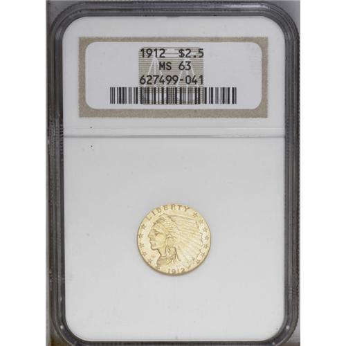 <B>1912<$2 1/2> MS63 NGC.</B></I> Boldly struck with satiny luster, appealing reddish-gold color, and a few superficial field blemishes on the reverse. A conservatively graded example worthy of a strong bid.