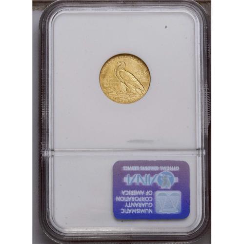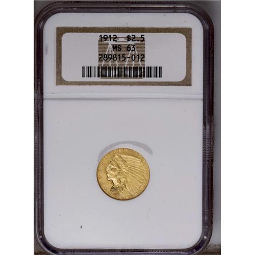 <B>1912<$2 1/2> MS63 NGC.</B></I> There is an overlay of light yellow-gold color on both sides, the surfaces also exhibiting an average impression from the dies, this probably being the grade-limiting factor. The features are relatively smooth for the assigned grade. <BR><BR><B>Important notice:</B> Heritage usually auctions material at the rate of 200-250 lots per hour. On some occasions eBay Live bid software or the Internet may not be able to keep up with the pace of the auction. We recommend placing a realistic absentee bid now as insurance to avoid disappointment. Occasionally the auctioneer may eliminate or reject an eBay Live bid, and the auctioneer may also reopen a lot after the close of the eBay live bidding (usually because we missed an audience bid), and may reject your bid even if it shows you as the winning bidder. By bidding via eBay Live, you agree that Heritage may award the lot to another bidder at its sole discretion under the circumstances described above or any other reasonable circumstances. Since eBay bids are not shown to us until we open the lot on the floor, we treat those bids just like floor bids. In most cases the floor responds before the eBay bid is presented to us, due to Internet lag time, so for consistency we have made it a policy that floor bids are always considered first over tie eBay live bids. Also please note that all Heritage lots purchased through eBay Live carry a 20% Buyer's Premium. Please make sure you read the Terms and Conditions before you bid. This lot is being auctioned in conjunction with a live floor auction by Heritage Galleries & Auctioneers. All final auction and invoice information will be supplied by Heritage Galleries & Auctioneers, and all other information should be considered preliminary. Lot:2492 <BR><BR><B>Winning Notification and Billing:</B> After the FINAL session in this auction is complete, Heritage will send e-mail and snail mail invoices. This process normally takes several days. All final auction and invoice information will be supplied by Heritage Galleries & Auctioneers, and all other information should be considered preliminary. <BR><BR>This auction will be conducted on a live auction floor and over the Internet through eBay Live. If you choose to place an absentee bid, please take a moment to <font color='#0000ff'><u><a href='http://pages.ebay.com/liveauctions/help/before/laabsentee.html'>learn how eBay Live absentee bidding works</a></u></font><font color='#000000'>