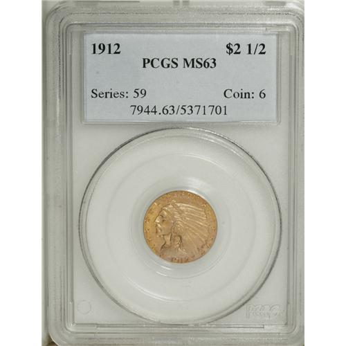 <B>1912 $2 1/2 MS63 PCGS.</B></I> Bright surfaces are endowed with pretty orange-gold patina that is imbued with traces of khaki-green and tan. Generally well struck, with fewer marks than what one might expect for the assigned grade.<BR><BR><b>Shipping:</b> Coin/Currency (<a target="_blank" href="http://www.heritageauctions.com/common/shipping.php">view shipping information</a>)