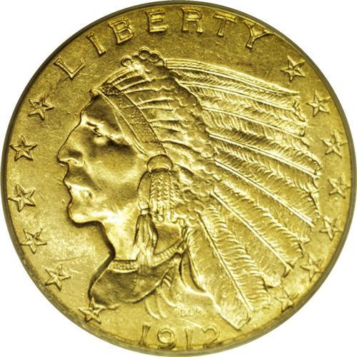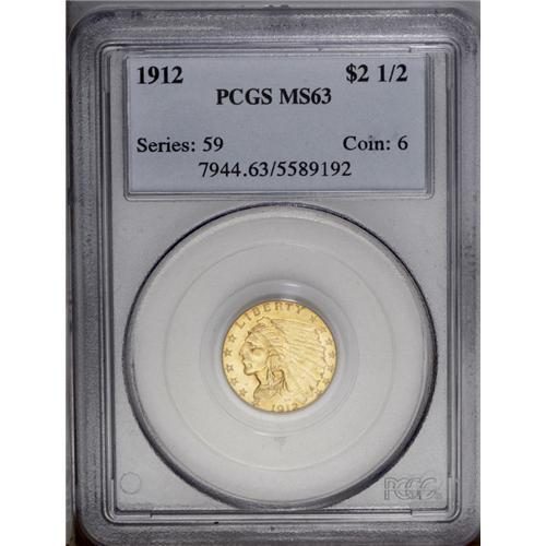 <B>1912 $2 1/2 MS63 PCGS.</B></I> Every feature is sharply defined and bright, satiny luster emanates from both sides. Only a few trivial disturbances are seen along the jawline of the Native American.