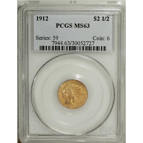 <B>1912 $2 1/2 MS63 PCGS.</B></I> Gold-orange with zones of rose and violet at the upper right obverse and in the reverse fields. The lustrous surfaces have few marks for the grade.<BR><BR><b>Shipping:</b> Coin/Currency (<a target="_blank" href="http://www.heritageauctions.com/common/shipping.php">view shipping information</a>)