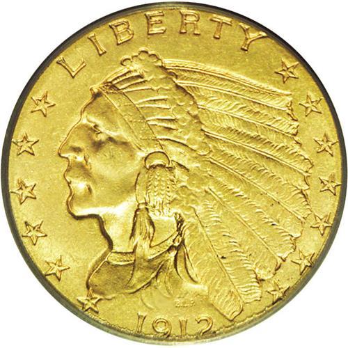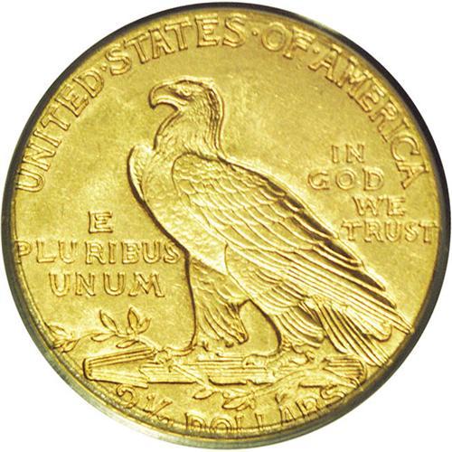 <B>1912<$2 1/2> MS63 PCGS.</B></I> Unquestionably original, both sides are mostly orange-gold in color with splashes of copper tinting here and there. The latter shade is most conspicuous in the recesses of the Indian on the obverse. Sharply struck with light granularity as is characteristic of this issue.