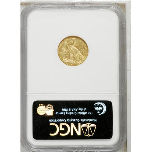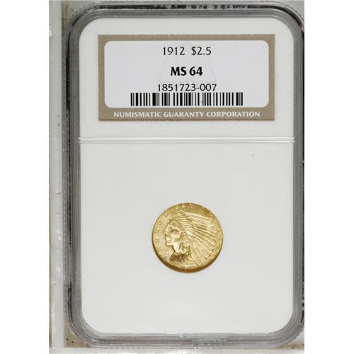 <B>1912<$2 1/2> MS64 NGC.</B></I> A bronze- to olive-gold piece with smooth surfaces in line with the assigned Choice grade. Luster and more than a bit of mint frost overlay the incuse relief devices. Despite a relatively high mintage for the series of 616,000 pieces, this is a better date in this grade and quite tough to find nicer.