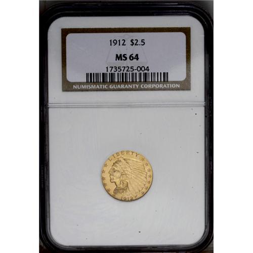 <B>1912<$2 1/2> MS64 NGC.</B></I> A lovely example of this somewhat scarce date with frosty yellow luster and excellent design definition. Slight abrasions and faint hairlines keep this from Gem grade levels.