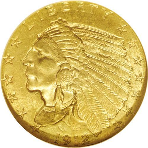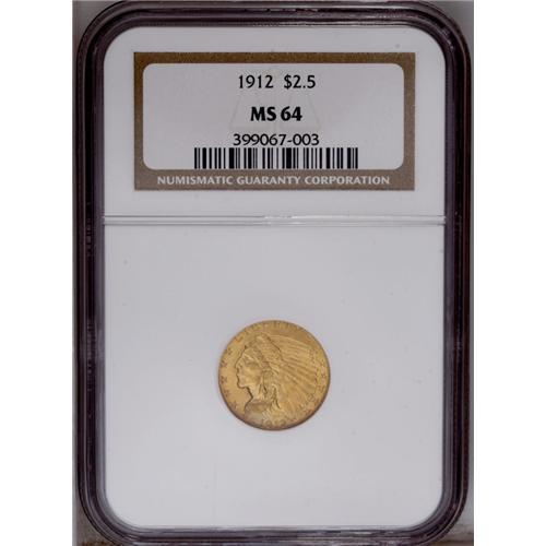 <B>1912 $2 1/2 MS64 NGC.</B></I> A sharply impressed example with rich, reddish-golden luster. A virtual Gem, a small field mark adjacent to the Indian's nose hardly detracts.