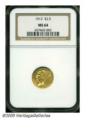 <B>1912<$2 1/2> MS64 NGC.</B></I> An exceptionally lustrous piece exhibiting a sharp strike and light, pleasant toning. A few field marks on either side serve to limit the grade.