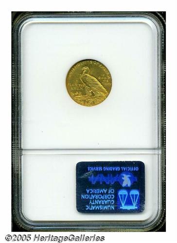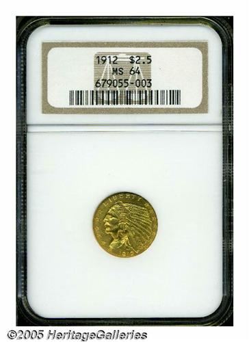 <B>1912<$2 1/2> MS64 NGC.</B></I> Sharply struck with intense yellow-gold color and satiny luster. A few small marks in the left obverse field keep this from Gem quality. Not considered a rarity, but in practice this is an extremely difficult date to locate in Choice or Gem grades.