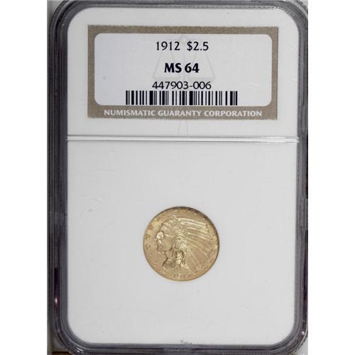 <B>1912 $2 1/2 MS64 NGC.</B></I> The yellow-gold surfaces have hints of orange and red in the fields. Solidly struck overall with a few small marks on and near the portrait.<BR><BR><b>Shipping:</b> Coin/Currency (<a target="_blank" href="http://www.heritageauctions.com/common/shipping.php">view shipping information</a>)