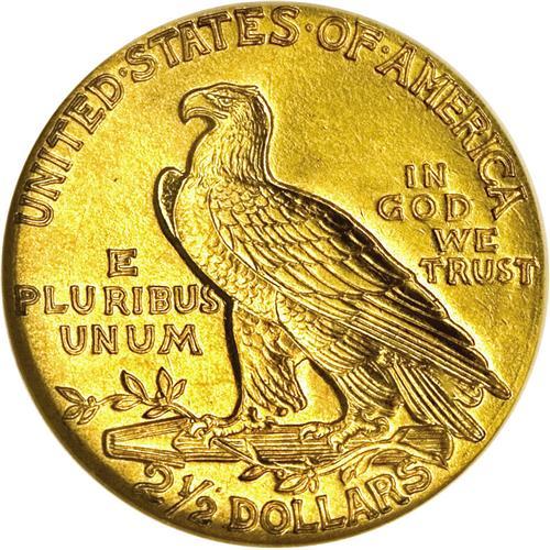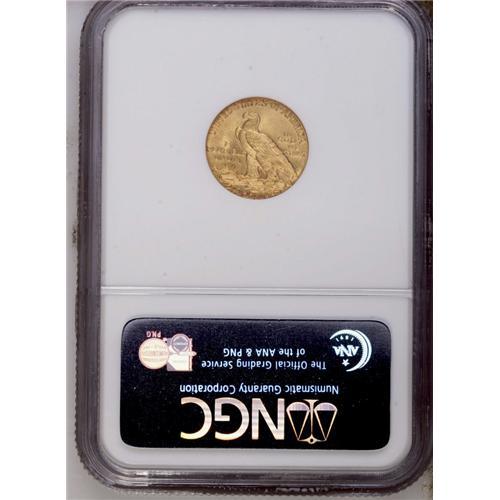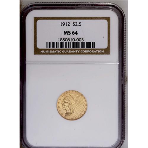 <B>1912<$2 1/2> MS64 NGC.</B></I> This shimmering and smooth near-Gem has light orange-gold toning, and the eye appeal is superior despite minor incompleteness of strike on the lowest portion of the headdress. Although the 1912 trades with only a moderate premium above the 'common' dates from the twenties, the NGC-certified MS64 population for the 1912 is not much more than the key 1911-D; 367 pieces versus 327 pieces (6/06).