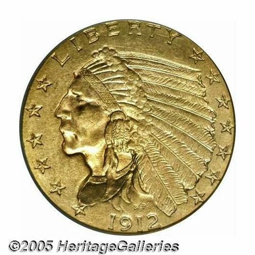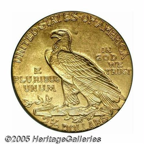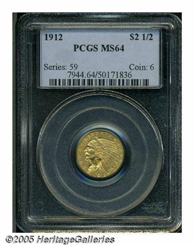 <B>1912<$2 1/2> MS64 PCGS.</B></I> Sharply struck with light yellow-gold color and excellent eye appeal. This example has satiny luster, unlike the other Choice example in the present sale. These two coins have entirely different looks.
