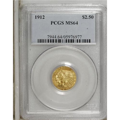 <B>1912 $2 1/2 MS64 PCGS.</B></I> The exposed fields of the incuse relief Indian Head type tend to attract a large number of surface markings even on Mint State coins, so when a piece in a Choice or finer grade appears, specialists take notice. This is a lustrous, honey-gold piece, with ample eye appeal and fields which have an unusual sparsity of abrasions, none of which individually distracts.<BR><BR><b>Shipping:</b> Coins & Currency (<a target="_blank" href="http://www.heritageauctions.com/common/shipping.php">view shipping information</a>)