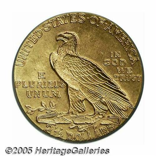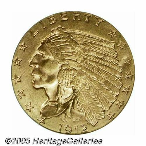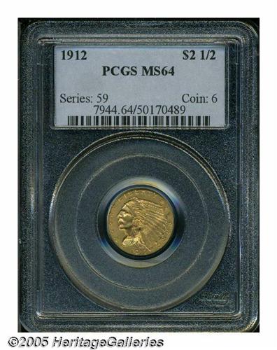 <B>1912<$2 1/2> MS64 PCGS.</B></I> This is a frosty example that just misses Gem quality. Although a number of different issues are rare in full Gem grades, this date is surprisingly elusive even in Choice quality. The surfaces have rich honey-gold coloration with wisps of toning on both sides. Sharply struck and attractive.