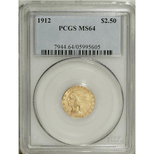 <B>1912 $2 1/2 MS64 PCGS.</B></I> This is a splendid near-Gem example with frosty yellow-gold luster and exceptional eye appeal. The 1912 quarter eagle is considered a common issue, but examples in Choice or Gem Mint State grades are difficult to locate. PCGS has only certified 53 finer examples of this date.<BR><BR><b>Shipping:</b> Coin/Currency (<a target="_blank" href="http://www.heritageauctions.com/common/shipping.php">view shipping information</a>)