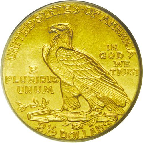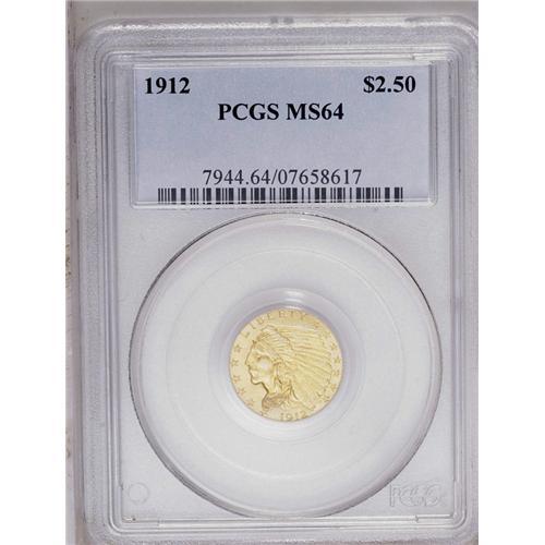 <B>1912<$2 1/2> MS64 PCGS.</B></I> Typically struck with satiny luster and lovely reddish-gold color. Well preserved with a few small, scattered blemishes. A small group of abrasions is seen on the Indian's cheek.