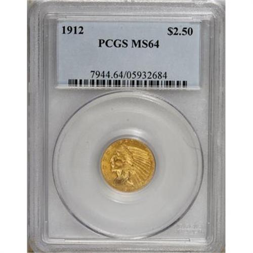 <B>1912 $2 1/2 MS64 PCGS.</B></I> This canary-gold Choice Indian quarter eagle is well struck aside from the customary minor blending of detail on the lower extremities of the headdress. Satiny luster shimmers across the unmarked surfaces. An attractive example of this popular and collectible gold type.<BR><BR><b>Shipping:</b> Coins & Currency (<a target="_blank" href="http://www.heritageauctions.com/common/shipping.php">view shipping information</a>)